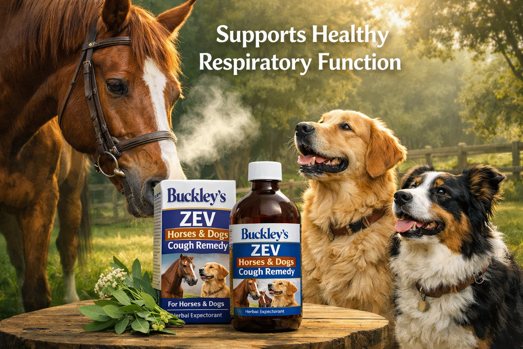 Buckley's ZEV Horses & Dogs Cough Remedy supports a horse's & dogs respiratory system.